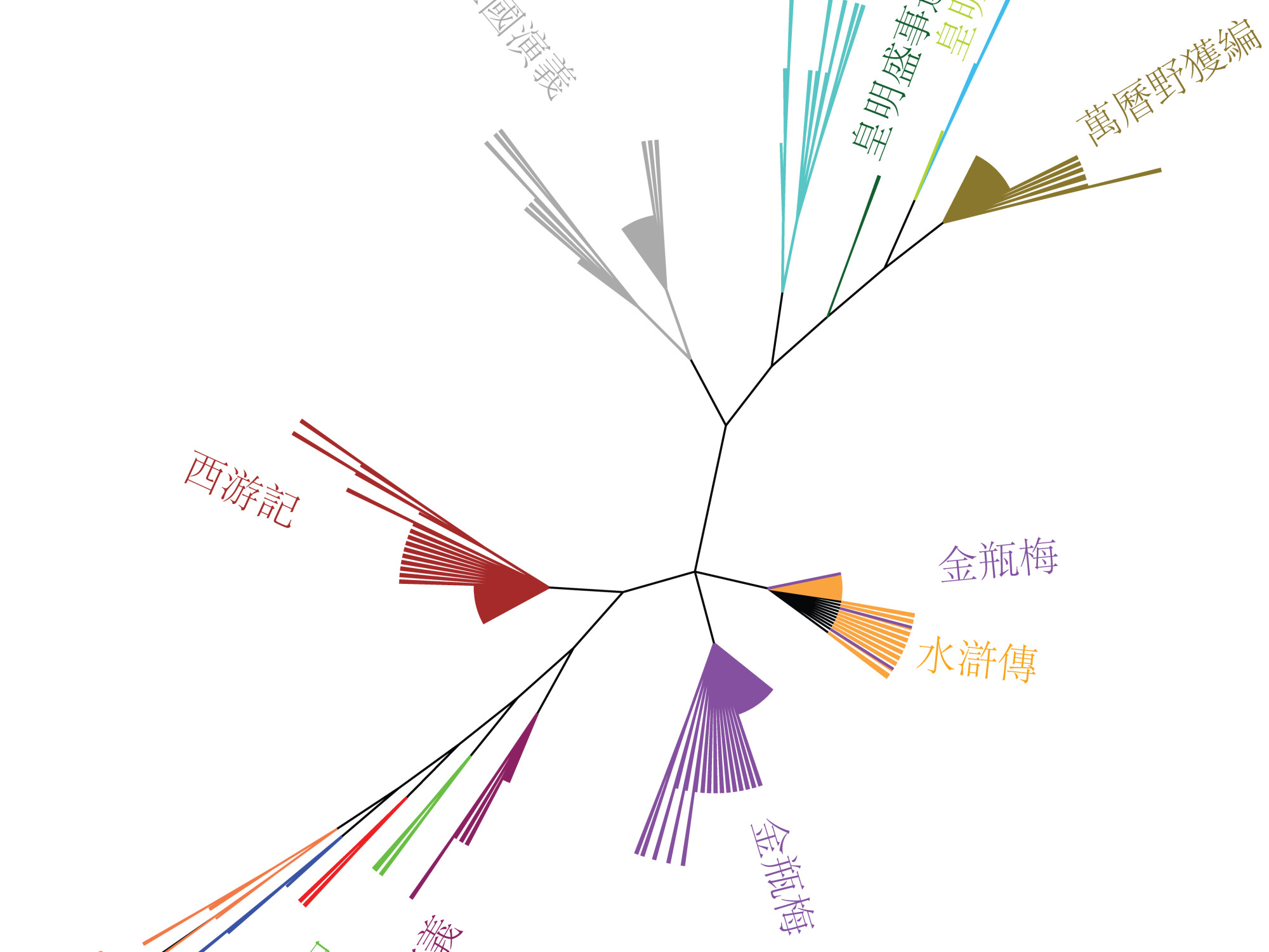 Image: Data Visualization by Paul Vierthaler. “Textual Similarity Among Fourteen Chinese Texts.” Modified from Figure 4.3 in Paul Vierthaler, “Quasi-History and Public Knowledge: A Social History of Unofficial Historical Narratives in Late-Ming and Early-Qing China.” Unpublished PhD diss., Yale University, 2014, p. 216. Reproduced with permission.